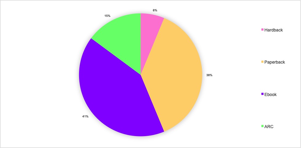 The stats for target audience really do go hand in hand with the genres I’ve read. Since I’ve been reading mostly romance it’s no surprise that most of the books I’ve been reading are for an adult audience.