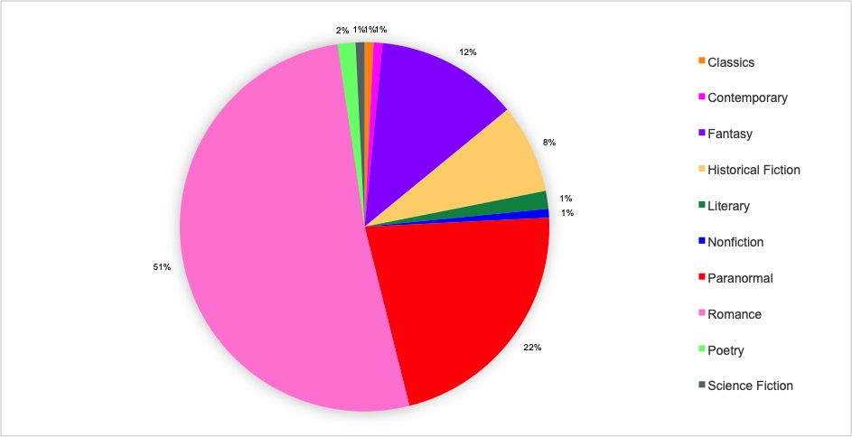 To breakdown the numbers; 66 were romance, 28 paranormal, 16 fantasy, 10 historical fiction, 2 literary fiction, 2 poetry and classics, contemporary, nonfiction and science fiction all had 1.