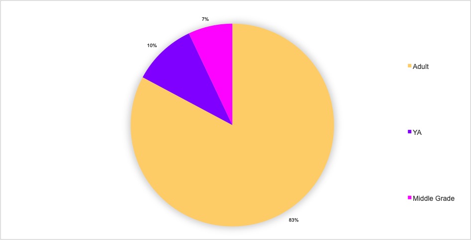 106 of the books were intended for an Adult audience, 13 were YA and 9 where Middle Grade.