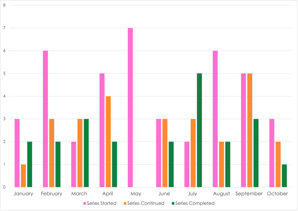I thought it would be fun to breakdown each month and see how many series I’ve started, continued and finished. After making this graph, it feels less fun πππ