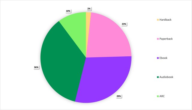 I read 142 digital books (49 eBooks, 16 digital ARCs and 60 Audiobooks) and 42 physical books (38 paperbacks, 3 hardbacks and 1 physical ARC).