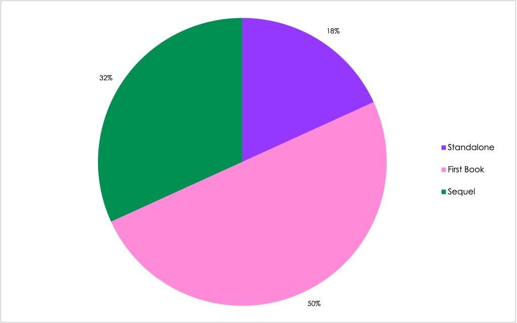 I am continuing to read more series books than standalone. I’m not loving that this quarter we’ve read way more first books then sequels. I do blame — well not blame but I can’t think of another work — the Summer Romantasyathon because I did start like 16 series during that challenge. I will be squeezing in some reading sequels months for the end of the year.