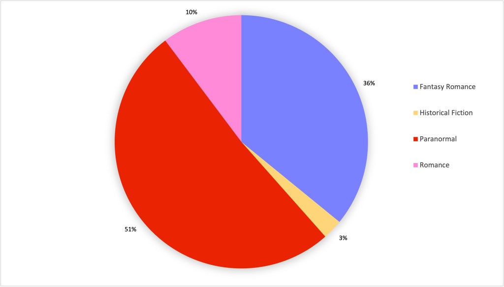 To break the genres down, I have read 14 fantasy romance books, 20 paranormal, 4 romance and 1 historical fiction book.